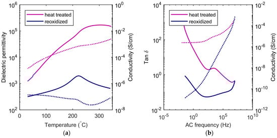 Dielectric permittivity measurements were also performed before and after reoxidation of the SBN33 ceramic heat treated at 1350 °C. The permittivity and ac conductivity at 1000 Hz are shown as a function of temperature before and after reoxidation in Figure 6a. Without reoxidation, the high conductivity overshadowed the dielectric properties, and accurate determination of TC became challenging. The frequency dependence of the dielectric loss and AC conductivity at ambient temperature are displayed in Figure 6b. Note that the reduction in the conductivity by reoxidation resulted in a ten-fold decrease in the magnitude of the apparent permittivity by reoxidation. This apparent rise in permittivity was due to the conductivity induced by the thermal reduction of Nb (Reaction 2). The conductivity at low frequencies is decreased by several orders of magnitude by reoxidation, while the conductivity at high frequencies is not affected.