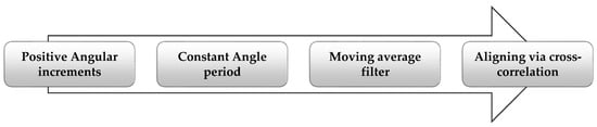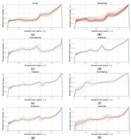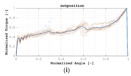 At the first stage of the analysis, acquired data had been pre-processed, aiming at data normalization and creating comparable data between each installation process. In this way, the process illustrated in Figure 4 was followed. At the first stage, data were switched from time domain to angular domain and was resampled at a constant angular period. A softening moving average filter was applied, and the resulting signal was normalized via cross-correlation to an artificial 0–1 normalized angular position and 0–1 torque values. Figure 5 shows all normalized signals.