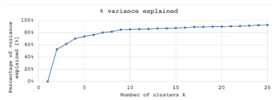 - Grouping into 9 clusters, k = 9.As shown in Figure 6, the higher the number of clusters, the higher the explained variance of the rivet installation data. Considering that riveted samples were obtained in 9 groups (see Table 2), and that higher values of k do not significantly increase the amount of variance explained, an analysis with k = 9 was performed.