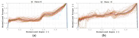 Clustering into k = 2 clusters lead to the clusters as shown in Figure 7, where all normalized angle/normalized torque plots are overlaid, and where the centroid of each cluster is remarked. Correspondingly, Table 3 lists the distribution of the samples among both clusters.