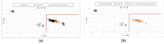 (a) (k = 2) Distribution of clusters in the J–K plane; (b) (k = 9) distribution of clusters in the J–K plane.
