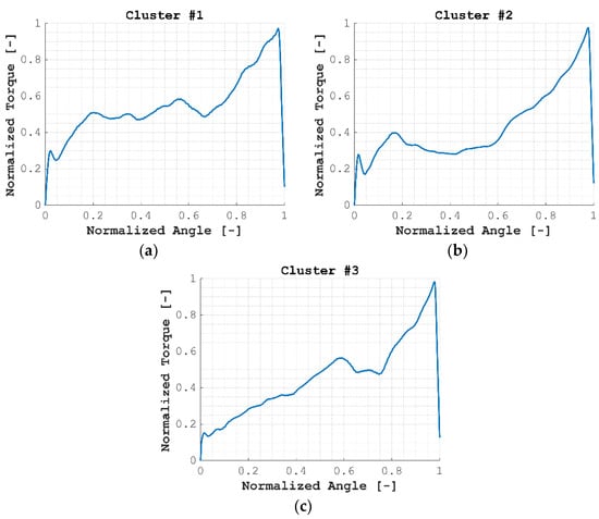 The centroid of each cluster is shown in Figure 9, where it was observed how centroids #1 and #2 showed more similarities among them than those with relation to centroid #3 (see for instance the initial states, between normalized angles 0–0.2), while centroid #3 behaved in a more linear manner until the normalized angle, 0.5.