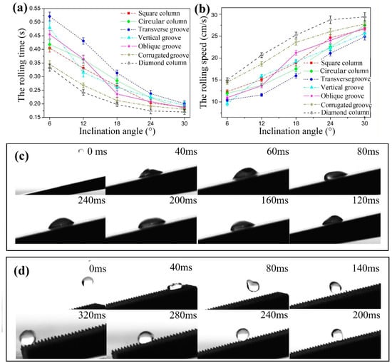 3.5. Droplet Rolling Performance on Textured Surfaces