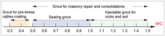 One of the fundamental parameters in cement-based grout is the water/cement ratio by weight. Depending on the application, different relationships are recommended. In applications of foundation by injection, the cementitious grout needs to behave like a fluid able to penetrate the soil or rock so the ratio will vary between 0.6 and 2. In sealed works, it varies between 0.5 and 1. Figure 1 presents a schematic of these recommendations.