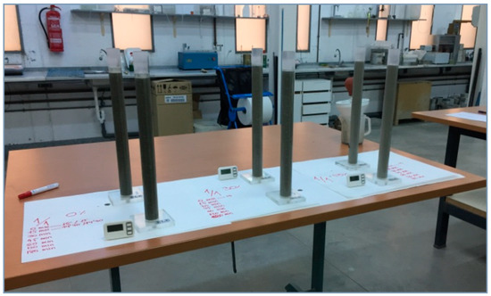 This test gives the exudation of the grout. It was carried out according to EN 445 [41] (Figure 2). Exudation was measured as the volume of water remaining on the surface of the mix that was kept protected from evaporation. The variation in volume was measured as a difference in percentage of the volume of the grout between the start and the end of the test. The test mainly measured the volume variation caused by sedimentation or expansion. A transparent tube, approximately 60 mm in internal diameter and around 1 m in length, was used. The tube was placed in a vertical position with the top end open. It ensured a rigid fixation that prevented any movement or vibration. The grout was poured into the tube with a constant flow to ensure that no trapped air remained. The tube was filled to a height, ho. The ambient temperature of the laboratory was 18.1 °C and the grout acquired a temperature of 18.3 °C. The start time t0 and the height h0 were recorded. The height of the cement grout, hg, was recorded at intervals of 15 min during the first hour, and then at 2 h, 3 h, and 4 h. The height of the exuded water, hw, was recorded at the same time as the measurements of the grout were made. Possible heterogeneities that could be seen in its appearance through the transparent tube were recorded. The volume variation was: