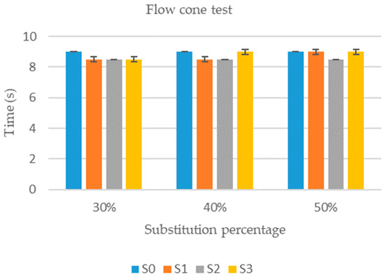 The test for the flow of grout mixtures (flow cone method) was determined according to the norm EN 445 [41]. The test determines the time of efflux of a specified volume of fluid cement grout through a standardized flow cone.