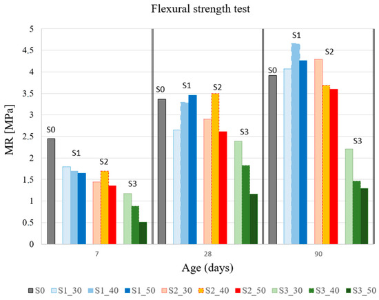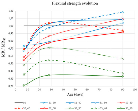 Flexural strength test results are shown in Table 3 for 10 mixtures at 7, 28, and 90 days. In Figure 4, the data are grouped according to time and percentage of substitution for each slag type. Figure 5 also allows for analyzing the behavior of each mixture with respect to the reference. Each result curve (MR) is non-dimensioned with respect to the corresponding value of S0 (MRS0).