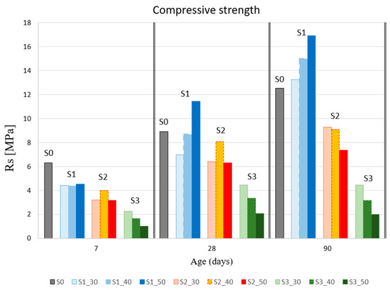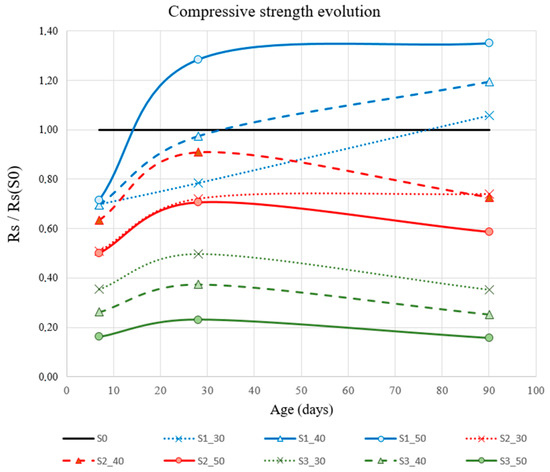 Compressive strength test results are shown in Table 4 for 18 test specimens at 7, 28, and 90 days. In Figure 6, the data are grouped according to time and percentage of substitution for each slag type (S1, S2, and S3). Figure 7 also allows for analyzing the behavior of each mixture with respect to the reference. Each result curve (Rs) is non-dimensioned with respect to the corresponding value of S0 (Rss0).