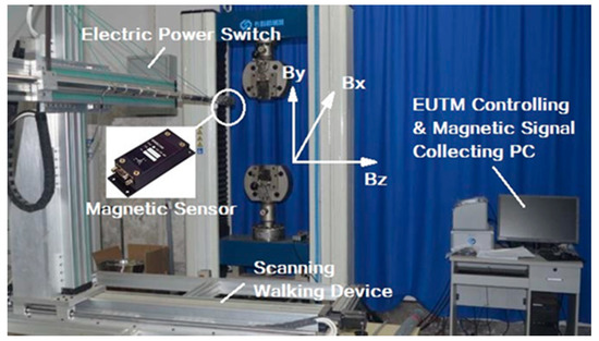 The length of the TSB specimen used in this test is 500 mm, and its chemical composition is shown in Table 1. A total of five diameter TSBs were used, which were 12 mm, 16 mm, 18 mm, 20 mm, and 25 mm (Ф 12, Ф 16, Ф 18, Ф 20, and Ф 25), and three test pieces were prepared for each diameter, numbered 1#, 2#, and 3#, respectively. The test instrument used for tensile loading of TSBs is EUTM. At the same time, the three-axis SMFL signal acquisition device designed and manufactured by ourselves is used to collect the SMFL signal of TSB during the tensile process. As shown in Figure 1, the device can continuously collect and record the SMFL signals in the X, Y, and Z directions. The magnetic signal sensor of the device is the Honeywell HMR2300 magnetic flux leakage signal collector (Morris Plains, NJ, USA).