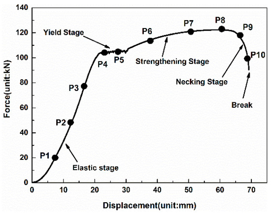 The tensile-displacement curve of the 1# TSB measured in the fixed-point monitoring test is used as the basis for the selection of TLDs for the 2# specimen in the axial scanning test. The method is to select 1~3 points for each stage of elasticity, yielding, strengthening, and necking of the 1# specimen from the tensile-displacement curve as the TLDs for the 2# TSB. As shown in Figure 2, taking the 16 mm diameter TSB as an example, points P1–P10 are selected TLDs according to the tensile-displacement curve measured of 1# TSB in this diameter group. In the axial scanning test, the 2# TSB is first loaded to the TLD corresponding to point P1, and then the EUTM is suspended for loading while the scanning test is performing. After the scanning test is finished, the TLD corresponding to the point P2 point is continuously loaded to process the scanning test until the end of test of the TLD corresponding to point P10. In the test, the 3# TSB corresponding to each diameter was used as the spare test piece.