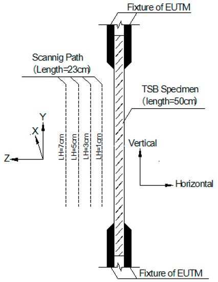 In the axial scanning test of 2# TSB, the magnetic sensor of the three-axis SMFL signal acquisition device designed and manufactured by ourselves was scanned along the axial direction of the TSB at four lift-off heights (LHs) paths of 1 cm, 3 cm, 5 cm, and 7 cm, respectively. Because there is a clamping length of the EUTM fixture of about 10 cm at both ends of the TSB, considering that the excessive clamping force will cause local magnetization, the influence cannot be ignored theoretically. Therefore, the axial scanning length is the 230 mm long section in the middle part of TSB after the clamp length in the two ends is subtracted. Figure 3 shows the schematic diagram of the scanning path length and LHs of the magnetic sensor in the axial scanning test.