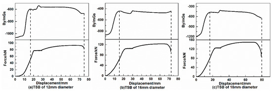 In terms of the variation law of the SMFL of the TSBs in the process of loading, the By signal curve for different TSB diameters is about the same. During the initial period of the loading process, the value of the By signal increases with the loading displacement, of which the numerical value increases largely about 400–700 mGs. When the loading displacement or tensile force reaches a certain size, one extreme point appears on the curve of By signal, and then the By signal enters a “platform stage”, after which it varies in a small range. The ratio of the tensile force corresponding to the extreme point before entering the “platform phase” on the By signal curve to the yield tension is generally close to 65%. In the process from when the By signal enters the “platform stage” to the TSB breaks, the variation range of By signal is small, within 200 mGs.