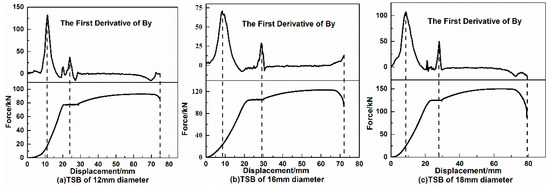 In order to study the variation rate of increase and decrease of the By signal during the loading process, the first derivative of the By signal curve corresponding to each diameter of TSB collected during the loading process is taken and plotted, as shown in Figure 5. Each upper half of Figure 5a–c is the first derivative curve of the By signal during the loading process, and each lower half of Figure 5a–c is the tensile-displacement curve. Since the results of each diameter are similar, the TSBs with diameters of 12 mm, 16 mm, and 18 mm are shown here as well. It can be known from Figure 5 that at the beginning of loading, the first derivative of the By signal increases sharply, and then reaches a fairly large peak. At this peak, the growth rate of the By signal reaches the maximum value; that is, the stagnation point during the initial loading stage on the By signal curve in Figure 4. Then, the TSB enters the yielding stage. In this stage, the first derivative curve also has a relatively obvious peak, but compared with the peak value at the beginning of loading, the value at this time is one-third to one-half of that. The value of other parts on the first derivative curve of By except for the two obvious peaks are close to 0, which indicates that the growth rate of these parts is relatively stable and does not change too much. At the moment when the TSB was loaded to break, the curve of the first derivative of the By signal did not change significantly. For the first derivative curve of the By signal, the quite obvious features are summarized as the two peaks appearing in the elastic stage and the yield stage, respectively. The peak value appearing in the elastic stage is several times that of the peak appearing in the yielding stage. The peaks appearing on the first derivative curve of the By signal in the yield stage are located in the second half of the yielding stage. All TSBs have peaks greater than 50 and less than 150 in the elastic phase, and the peaks in the yielding stage are less than 50 but greater than 20.