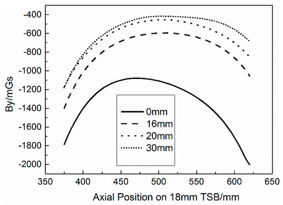 Figure 6 shows the axial scanning test results of a 230 mm length section of the 18 mm diameter TSB with the TLDs of 4 mm, 16 mm, 20 mm, and 30 mm when the LH value is 3 cm. Because the TLDs of the axial scanning test result are too many, in order to more clearly show the By signal variation along the axial direction of TSB, only the results of the above TLDs are shown in the figure. It can be seen from Figure 6 that for the distribution of the axial scanning test results along the axial direction of TSB, the By signal in the two ends is small and in the middle section of specimen is large, of which the minimum value on the entire TSB scanning curve appears at one of the two ends, and the maximum value appears in the middle, but not necessarily at the midpoint of the curve. The By signal values are continuously and evenly transitioned from the ends to the middle without significant numerical jump. The whole axial By scanning curve is quite smooth and there is no fluctuation on it locally. According to the knowledge of MMM, under the action of the geomagnetic magnet field, the phenomenon of spontaneous magnetization of metal ferromagnetic work pieces occurs. In the defect of the work piece, the leakage magnetic field will be generated, and the abnormal change of the magnetic field will occur. The position of non-defective will show a stable and consistent magnetic field distribution in contrast [34,35]. The TSB used for the axial scanning test has no local defects. During the loading process, the internal stress of TSB is theoretically the same when the TLD is kept in one value. Therefore, when the TSB is subjected to magnetization caused by the interaction of the geomagnetic magnetic field and internal stress, the result of the axial scanning test displays the smooth curve. The reason the signal value at both ends of the scanning section is smaller than the middle can be explained as the end effect of TSB. Additionally, as the TLD value increases, the whole scanning curve has a tendency to move upwards; that is, the overall value increases. At the beginning of the loading process, the increment of the overall upward movement of the curve is large while the increment of the upward movement is small at the latter loading process, of which the variation at one point on the axial scanning curve of the By signal is similar to the test results in the fixed-point monitoring test.