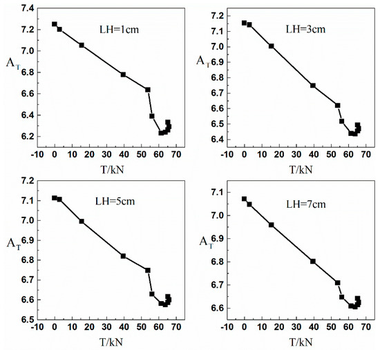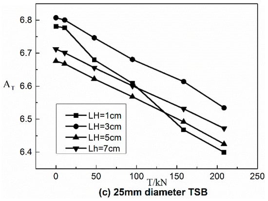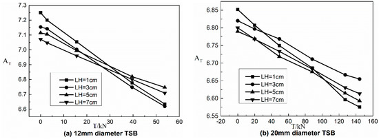 Table A1, Table A2, Table A3, Table A4, Table A5, Table A6, Table A7, Table A8, Table A9, Table A10, Table A11 and Table A12 in the Appendix A of this paper show the calculation results of 12 mm, 20 mm, and 25 mm TSB at LH of 1 cm, 3 cm, 5 cm, and 7 cm, respectively. Because the results are similar, only the calculation results of the above diameters are listed. The calculated is taken as the ordinate, the corresponding tensile force value of each TLD on the tensile-displacement curve is taken as the abscissa, and the -T graphs of TSBs of different diameters under different LHs can be drawn, as shown in Figure 7.