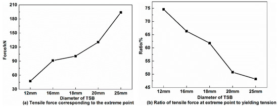 The tensile force corresponding to the extreme point on the By curve in the fixed-point monitoring test with different TSB diameters. (a) Tensile force corresponding to the extreme point, (b) Ratio of tensile force at extreme point to yielding tension.