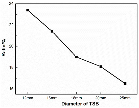 The ratio of the tensile force corresponding to the peak value on the first derivative curve of the By signal to the yield tension with different TSB diameters of the elastic stage in the fixed-point monitoring test (%).