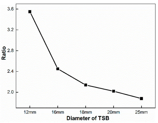 The ratio of the two peak values on the first derivative curve of the By signal in the fixed-point monitoring test with different TSB diameters.