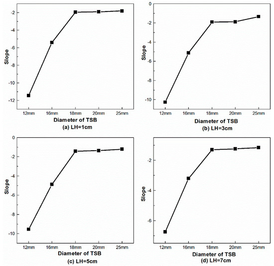 The slope of the linear segment in the -T diagram with different TSB diameters in the axial scanning test. (a) LH = 1 cm, (b) LH = 3 cm, (c) LH = 5 cm and (d) LH = 7 cm.