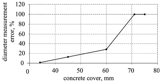 The depth of rebars location has a significant impact on the accuracy of diameter measurements, and even on the accuracy of rebars location. The maximum depth, at which reinforcement can be detected, depends on the diameter of rebars. For typical rebar diameters of 6–25 mm, depending on the employed device, the biggest depth at which the reinforcement can be detected is 100–200 mm. The closer location of rebars to the scanned surface evidently ensures a greater accuracy of the measured and real diameter. The acceptable measurement accuracy (5%) of the reinforcement diameter is obtained when the rebars are located at a depth of ca. 60 mm. Unfortunately, electromagnetic methods are not effective in detecting the non-metallic reinforcement, which is becoming increasingly common [12,13].