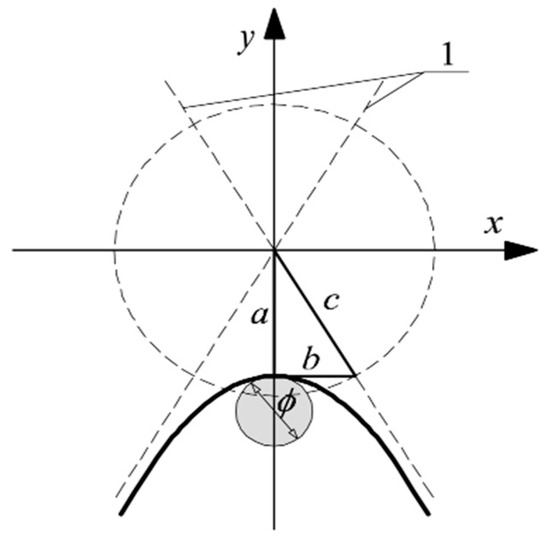 The papers [18,19,20,21,22,23,24] describe that the shape of hyperbola illustrating the reinforcement on the radargram depends on the wave propagation velocity υ and passage time t0 of measuring the probe above the tested reinforcement. The time of the measuring probe passage is the time passing from the moment when the device records the reinforcement for the first time until the moment when it stops to record it. The velocity of the wave propagation affected the hyperbola curve, whereas the time of the probe passage affected the range of its arms. Knowing the parameter values a and b of the hyperbola b (Figure 2), their relation with the reinforcement diameter ϕ, wave propagation velocity υ, and time of probe passage t0, on the tested reinforcement can be expressed, as following: