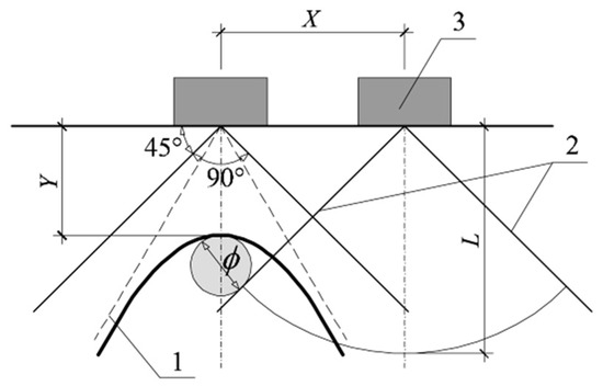 Another way of defining the diameter was suggested in the paper [26]. It was assumed that the impulse distribution angle from the transmitting antenna was 90° (Figure 3). Such an assumption was useful in determining the rebar diameter without taking into account the wave propagation velocity υ and passage time t0 of the measuring probe above the tested reinforcement. The reinforcement diameter ϕ can be determined according to: