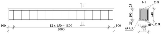 To verify the accuracy of NDT methods, some tests were performed on widely used lintels that were made of AAC with the width of b = 180 mm, height h = 240 mm and the total length of L = 2000 mm. The strength of AAC elements was f = 4 N/mm2. Detailed results from the material tests on lintels can be found in the papers [29,30,31,32]. The lintel reinforcement was made of steel with a yield strength of 500 N/mm2 (B class according to EN 1992-1-1:2008 [33]). Longitudinal rebars had a diameter of 8 mm (three rebars down and two rebars up). Longitudinal reinforcement in the form of open stirrups that were made of rebars having a diameter of 4.5 mm. Stirrups were placed along the whole element at a constant spacing of 150 mm (Figure 4). The longitudinal reinforcement and stirrups were welded and then covered with corrosion-resistant protective coating made of resin.
