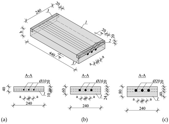 Lightweight concrete specimens: (a) specimen reinforced with rebars of 10 mm diameter, (b) specimen reinforced with rebars of 16 mm diameter, (c) specimen reinforced with rebars of 20 mm diameter, 1—lightweight concrete, 2—rebars, 3—wooden washer.