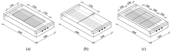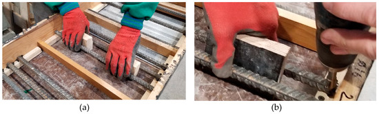 The impact of bar diameter and spacing on measurement accuracy was tested on nine models (Figure 6) that were prepared from lightweight concrete with density of 0.9 kN/m3 and strength of 10.2 N/mm2 after seven days, and of 18.1 N/mm2 after 28 days. Each model had three rebars that were arranged to ensure the distance between rebars equal to 20, 30, and 40 mm (dimension “a” in Figure 6). The diameter of used rebars was ø = 10; 16; and, 20 mm. The dimensions of models in a plain view were 240 × 440 mm and thickness of 40, 60, and 80 mm. Different thickness was to ensure the correct (two-sided) cover of rebars with concrete assuming that rebar distance from one of the surface was 20 mm. It is the minimum thickness that is accepted by the standard EN 1996-1-1 [33] for the exposure class XC1 (indoor) and the structural class S3. The wooden elements were precisely cut to provide the cover thickness of 20 mm. Reinforcement was laid using wooden spacers of relevant thicknesses (Figure 7a), and then stabilized in washers with screws (Figure 7b). Concrete was laid, mechanically compacted, and properly cured. Figure 8 shows models before and after concreting. Specimens symbols contained a letter S, diameter d, and space between rebars a. For example, S-15-30 identified a specimen that was reinforced with three rebars having a diameter of 16 mm and space between rebars that is equal to 30 mm.