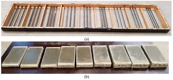 Specimen reinforcement in formwork (a) and specimens after concreting (b).