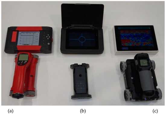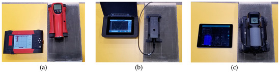 Tests on lightweight concrete specimens, just as tests on lintels, consisted in scanning along lines or on surfaces that were routed on a given element using the transducer. The lightweight concrete specimens were tested using the electromagnetic Equipment (1) over the area of 150 × 300 mm illustrated in Figure 12a. The electromagnetic Equipment (2) was used to perform line scans at the mid-length of the specimen (Figure 12b), while area scans were conducted with the radar equipment over the area of 200 × 300 mm, as shown in Figure 12c. At the first stage, scans were conducted on the element surface where the concrete thickness was 20 mm, and then the element was turned to conduct further scans. Concrete cover was 10, 24, and 40 mm for rebars having a diameter of 10, 16, and 20 mm. Figure 13 shows the types of used equipment.