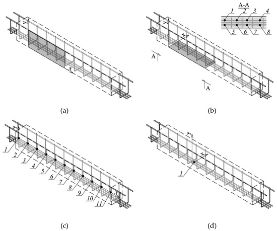 Places of lintel tests: (a) Stirrup tests—area scan (measurement in the grey-coloured field), (b) main reinforcement test—area scan (measurement in the grey-coloured field, measurement at points 1–8), (c) Stirrup tests—line scan (measurement at points 1–11), and (d) main reinforcement test—line scan (measurement at point 1).