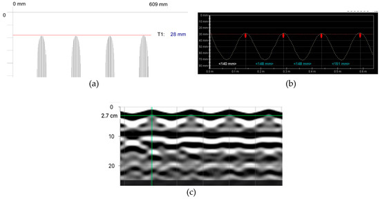Line scans (measurement at points shown in Figure 10c) with devices: (a) electromagnetic 1, average cover of visible results—27.8 mm, (b) electromagnetic 2, average cover—28.6 mm, (c) radar 3, average cover 27 mm.