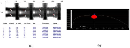 Scans taken with electromagnetic devices, (a) device 1, two rebars detected, average cover of visible results—33.6 mm, diameter 6-8 mm (measurement on the surface shown in Figure 10b), (b) device 2, one rebar detected, average cover of visible results—28 mm, diameter 18 mm (measurement at the point shown in Figure 11d).