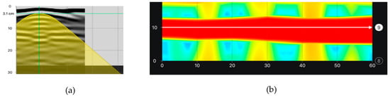 Area scans conducted with electromagnetic devices (measurement on the surface shown in Figure 10a), (a) electromagnetic 1, average cover of visible results– 27.8 mm, (b) radar 3,– 27 mm.