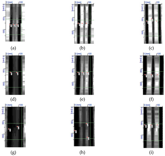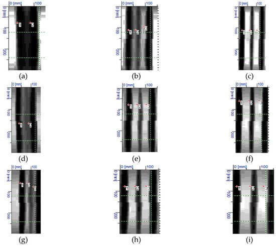 Results from tests performed with the electromagnetic device (2): (a) S-10-20 (result: one bar, øobs = 8 mm, cobs = 20 mm), (b) S-10-30 (three rebars, øobs = 10 mm, cobs = 19.3, mm), (c) S-10-40 (three rebars, øobs = 9 mm, cobs = 19.3 mm), (d) S-16-20 (three rebars, øobs = 17 mm, cobs = 15.5, mm), (e) S-16-30 (three rebars, øobs = 15 mm, cobs = 16.4, mm), (f) S-16-40 (three rebars, øobs = 14 mm, cobs = 16.5, mm), (g) S-20-20 (three rebars, øobs = 19 mm, cobs = 15 mm), (h) S-20-30 (three rebars, øobs = 19 mm, cobs = 15.4 mm), and (i) S-20-40 (three rebars, øobs = 18 mm, cobs = 18.3 mm).