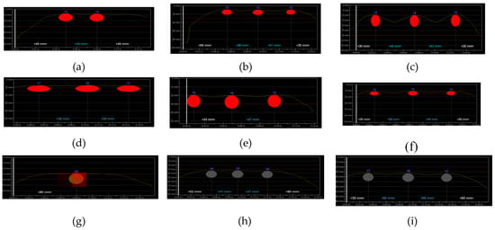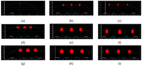 Results from tests performed with the electromagnetic device (2): (a) S-10-20 (result: two rebars, øobs = 14 mm, cobs = 7.8 mm), (b) S-10-30 (three rebars, øobs = 13 mm, cobs = 9.7 mm), (c) S-10-40 (three rebars, øobs = 12 mm, cobs = 9.7 mm), (d) S-16-20 (three rebars, øobs = 17 mm, cobs = 19.5, mm), (e) S-16-30 (three rebars, øobs = 16 mm, cobs = 19.8 mm), (f) S-16-40 (three rebars, øobs = 14 mm, cobs = 21.9 mm), (g) S-20-20 (one rebar, øobs = 20 mm, cobs = 29 mm), (h) S-20-30 (three rebars, øob = 18 mm, cobs = 33.5 mm), (i) S-20-40 (three rebars, øobs = 17 mm, cobs = 33.1 mm).