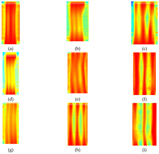 Results from tests performer with the radar equipment (3): (a) S-10-20 (result: three rebars, cobs = 22 mm), (b) S-10-30 (three rebars, cobs = 22 mm), (c) S-10-40 (three rebars, cobs = 21 mm), (d) S-16-20 (three rebars, cobs = 22 mm), (e) S-16-30 (three rebars, cobs = 21 mm), (f) S-16-40 (three rebars, cobs = 20 mm), (g) S-20-20 (three rebars, cobs = 22 mm), (h) S-20-30 (three rebars, cobs = 20 mm), (i) S-20-40 (three rebars, cobs = 20 mm).