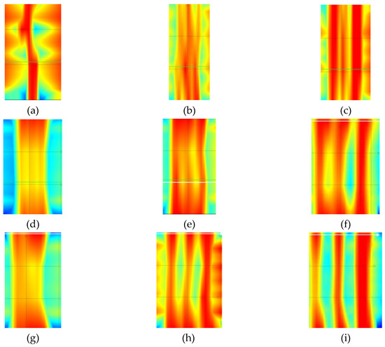 Results from tests performed with the radar equipment (3): (a) S-10-20 (result: one rebar, cobs = 11 mm), (b) S-10-30 (three rebars, cobs = 12 mm), (c) S-10-40 (three rebars, cobs = 11 mm), (d) S-16-20 (three rebars, cobs = 23 mm), (e) S-16-30 (three rebars, cobs = 24 mm), (f) S-16-40 (three rebars, cobs = 23 mm), (g) S-20-20 (two rebars, cobs = 38 mm), (h) S-20-30 (three rebars, cobs = 40 mm), (i) S-20-40 (three rebars, cobs = 41 mm).