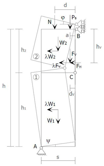 A recurrent case of out-of-plane collapse is caused by the floors of a multi-story building. Actually, due to the oscillatory nature of the earthquake forces, when the earthquake direction is orthogonal to a wall of a multi-story building, the wall receives subsequent out-of-plane thrusts from the floors, known as the hammering actions of the floors on the wall. The subsequent pulses of the earthquake may lead the wall to either overturn or break into two parts. This second failure mechanism, which is the most usual one, activates when an upper kerb retains the wall and takes place with either a partial mechanism (Figure 1a) or a global mechanism (Figure 1b). In both cases, the wall breaks with the formation of a third hinge in correspondence of one of the floors (Figure 2). As far as the meaning of symbols in Figure 2 is concerned: