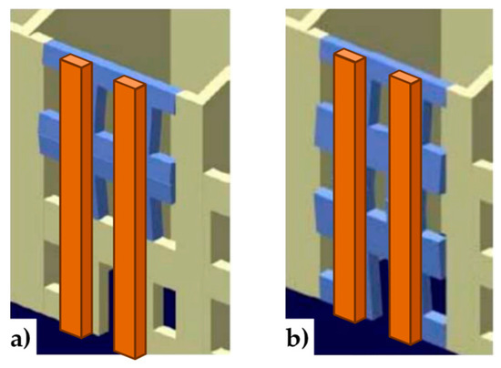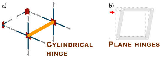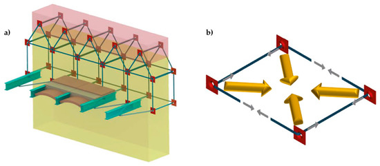 The holes drilled in the masonry wall behave as cylindrical hinges (Figure 12a), even when filling the holes with mortar after the retrofit. This is particularly detrimental to the rectangular arrangement of the CAM system. Actually, the straps form unbraced rectangular frame structures with hinged nodes (Figure 12b) both in the plane of the wall and the thickness of the wall. Since the unbraced rectangular frame structures are not able to withstand lateral forces and sway laterally, the rectangular arrangement of the CAM system is labile along both the in plane (Figure 13a) and transverse directions of the wall (Figure 13b). In particular, it is not able to counteract the out-of-plane loads, which is not suitable for increasing the ultimate load of collapse when the directional properties of the earthquake involve a hammering action of floors on the walls. This is why it is necessary to combine the CAM system with other reinforcement techniques to increase the strength of the wall to the hammering actions.