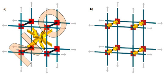 The discussion on the effectiveness of the CAM system provided in Reference [5] shows that the nodes of the rectangular CAM net are subjected to pairs of equal and opposite forces in the plane of the wall (Figure 5a). Consequently, they do not receive any in-plane force from the retrofitting system and do not have neither horizontal nor vertical displacements. The only nodal force not balanced by an equal and opposite force is the transverse force (Figure 5b). This means that the actual mechanism of stress-transfer from the rectangular CAM net to the masonry wall is not hydrostatic (Figure 6a), which was believed in the early studies on the CAM system [7,8,9,10,11,12,13,14]. In fact, by eliminating the balanced forces, only the transverse forces will remain, as shown in Figure 6b. Being aware of this last statement is of paramount importance for a structural engineer. In fact, one of the main consequences of replacing Figure 6a with Figure 6b is that the value of stress in the straps becomes upper bounded. In other words, there is an upper limit value of the strap stress, which it is not possible to overcome without damaging the masonry [5].
