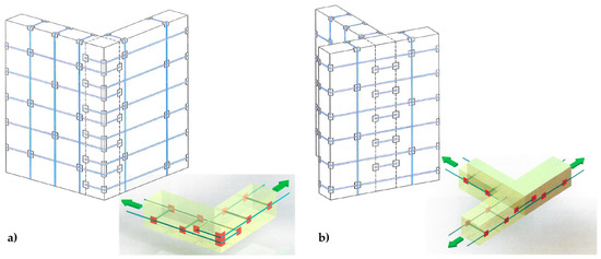 Connections between orthogonal walls, with details of the arrangement of the ribbons in the thickness: (a) at a building corner and (b) at an intersection between walls.