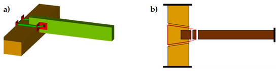 It is precisely the possibility of designing the stiffness of the transverse link that allows the use of the CAM system to build an embedded buttress. In fact, the most common way to build an embedded buttress with a traditional technique is to incorporate an FRP I-beam in the thickness of the wall, placing the two flanges vertically on the two faces of the wall to maximize the moment of inertia. As well known, the cross-section of a bent I-beam (Figure 16a) behaves as two ideal point-masses, linked by a stiffness constraint (Figure 16b). The idea behind this paper is that it is possible to reverse the path in Figure 16, moving from two masses, linked by a stiffness constraint, to an (ideal) beam under bending load. In this case, by establishing a stiffness constraint between two masses placed on the two sides of the masonry wall, it is possible to obtain an (ideal) embedded buttress without having to cut the masonry wall to insert a beam.