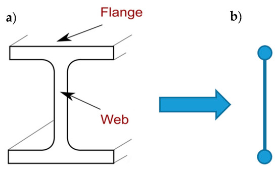 (a) Cross-section of an I-beam; (b) Ideal scheme of behavior of an I-beam in its cross-section: two point masses, linked by a stiffness constraint.