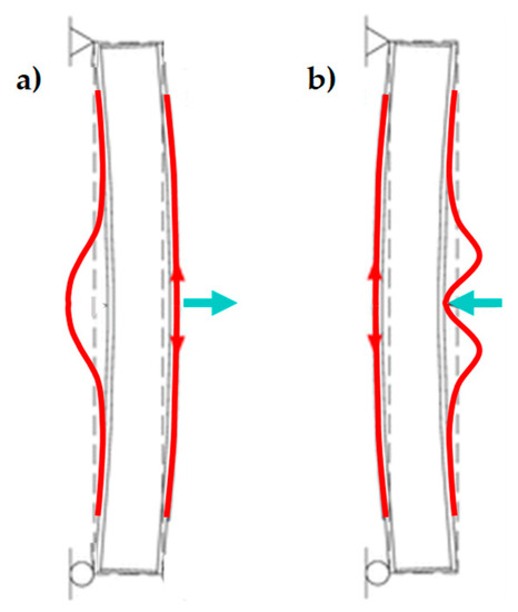 Buckling of the compressed CFRP strip for the two possible positions of the load: (a) load applied on the side opposite to that of buckling and (b) load applied on the side of buckling, pushing on the compressed CFRP strip.