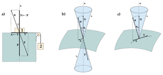 Friction forces in static and dynamic conditions: (a) forces at the interface between a body at rest (body 1) and its support body, (b) cone of static friction, and (c) cone of kinetic friction.