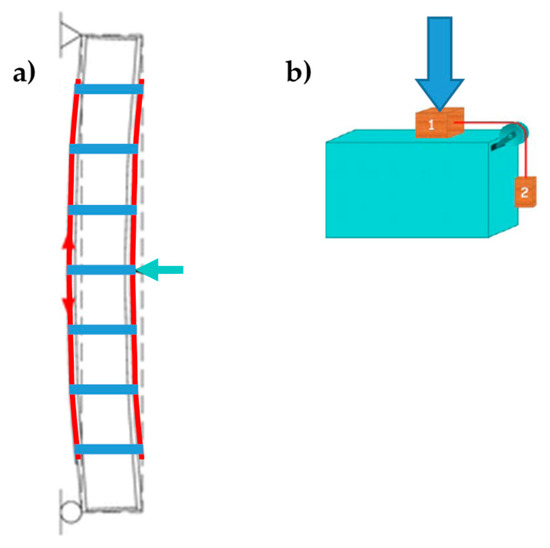 Bending of the CFRP strips tied by the CAM straps: (a) the straps counteract the delamination on both sides of the beam. (b) At the interface between a CFRP strip (body 1) and the beam (support body), the compression force (blue arrow) provided by a strap to the CFRP strip adds a physical bond that counteracts the sliding of body 1 on the body of support, caused by the sheer force (represented by the action of body 2 on body 1).