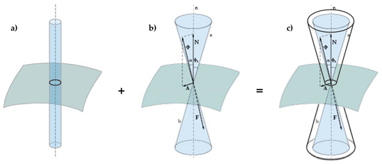 Limit surfaces in static conditions: (a) limit surface of the chemical bond, with the shear forces that determine the limit condition, independently of the compression forces, (b) cone of static friction, and (c) cone of cohesive static friction, which results from the combination between the limit surface of the chemical bond and the cone of static friction.