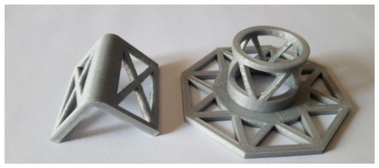 To protect the rounded corners of the 3D printed elements, the second combined technique also uses some small pieces of steel ribbons, inserted between the steel wire ropes and the PLA elements (Figure 54b, Figure 55b,c, and Figure 56). In fact, in the absence of the pieces of steel ribbons, the pre-tensioning causes the steel wire ropes to indent the rounded corners of the 3D printed elements, as shown in Figure 55a.